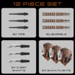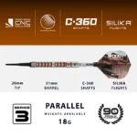 "PDCプレイヤー「Luke Woodhouse」モデル。 バレル全体にわたり、精密なシャークカットリンググリップを採用。 各リングには6本の横方向の切削加工を施し、トラクションとコントロール性を向上させています。 新たに施した超微細サンドブラスト加工仕上げにより、手に確かな安心感と快適なフィット感をもたらし、ゲーム中のプレッシャー下でもスムーズで安定したリリースを実現します。